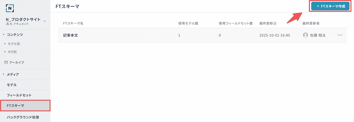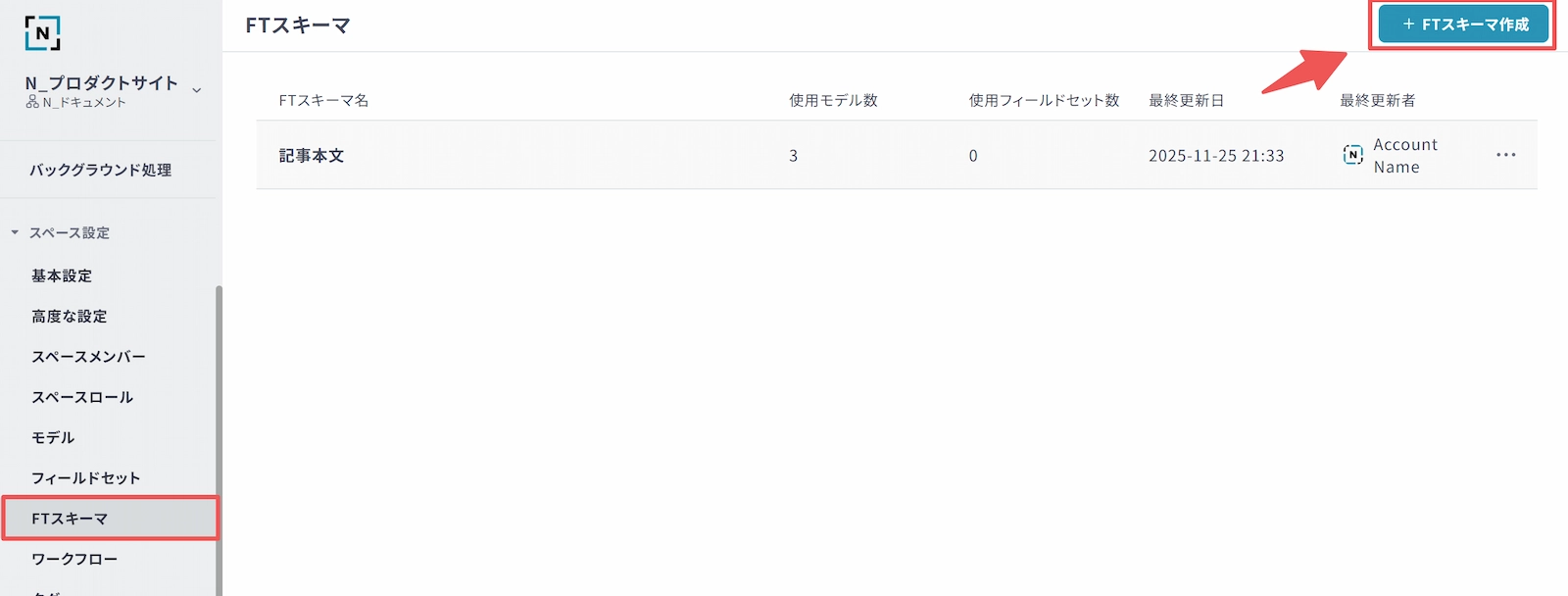 右上の[+FTスキーマ作成]からFTスキーマを新しく作成します。