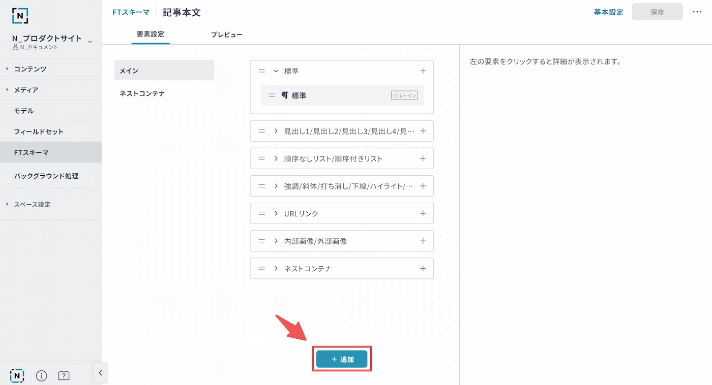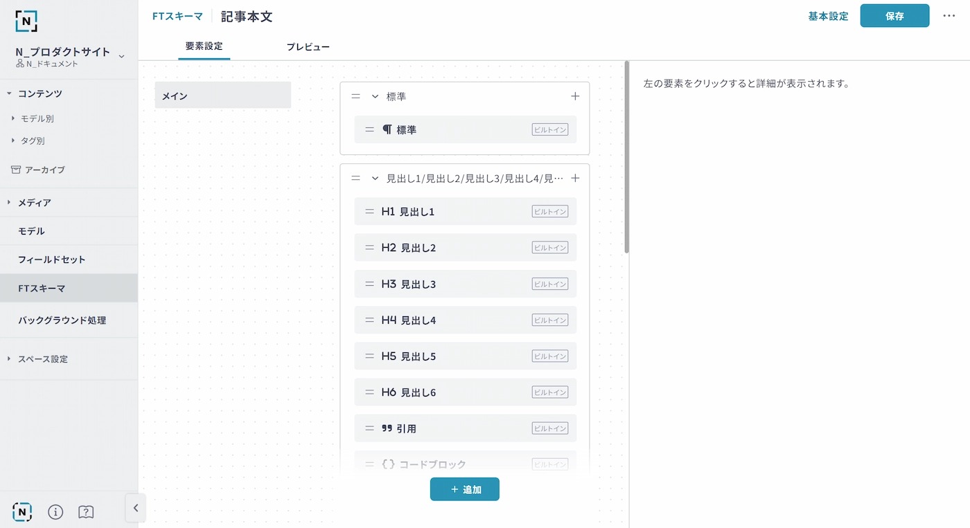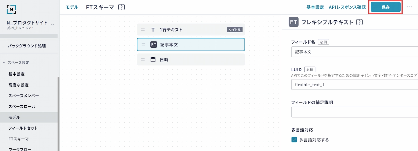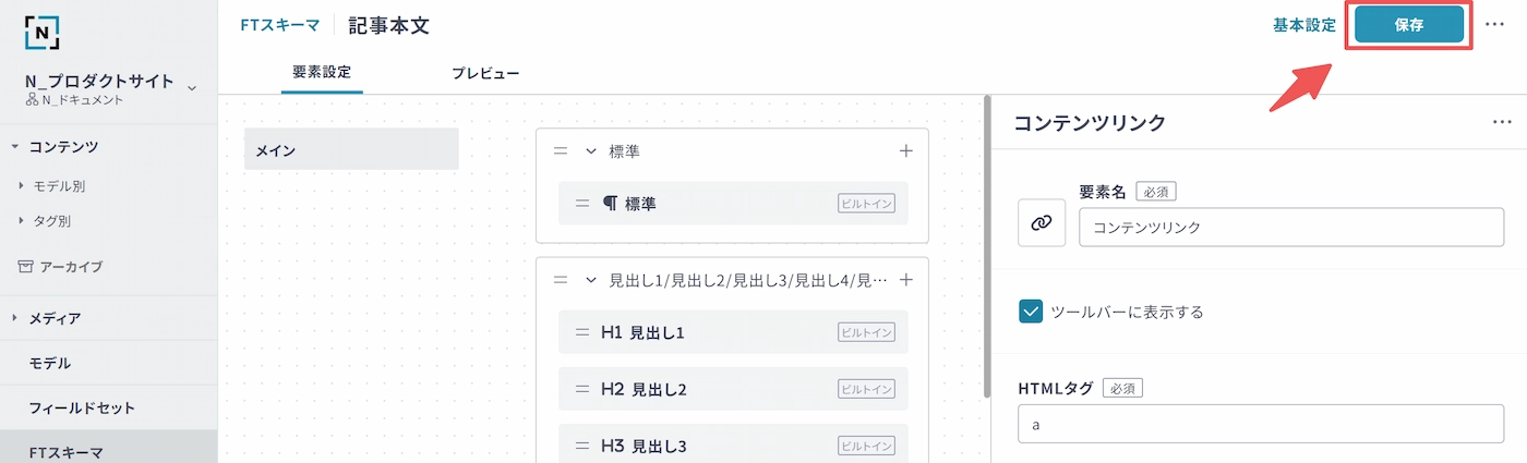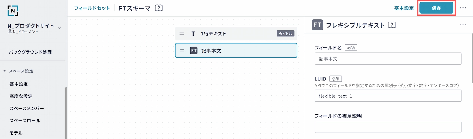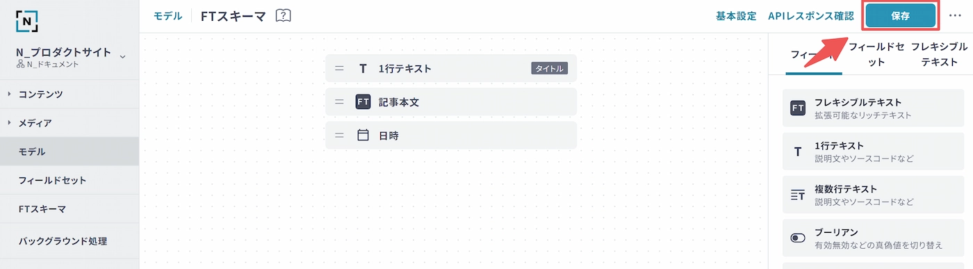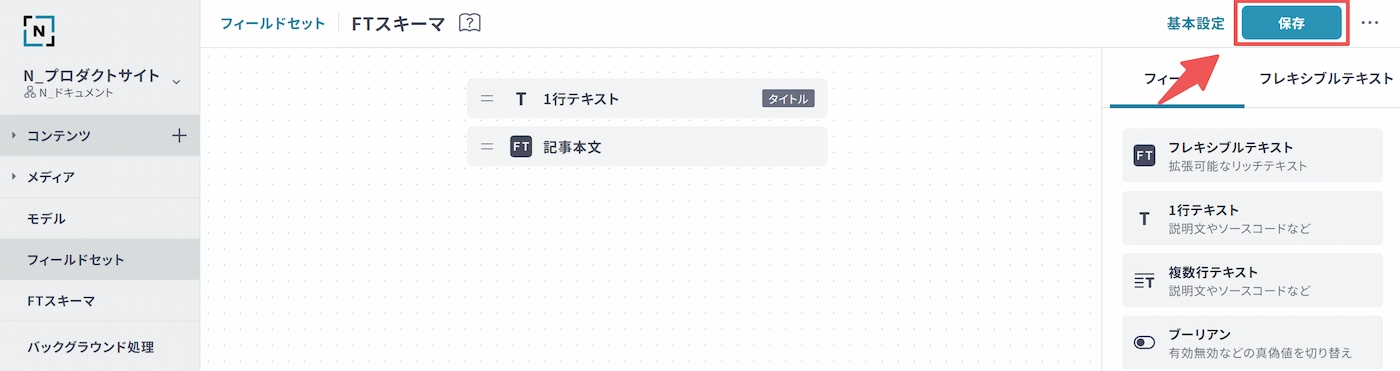 今回は設定の変更や要素の追加をせず、右上の[保存]を押してFTスキーマを保存します。