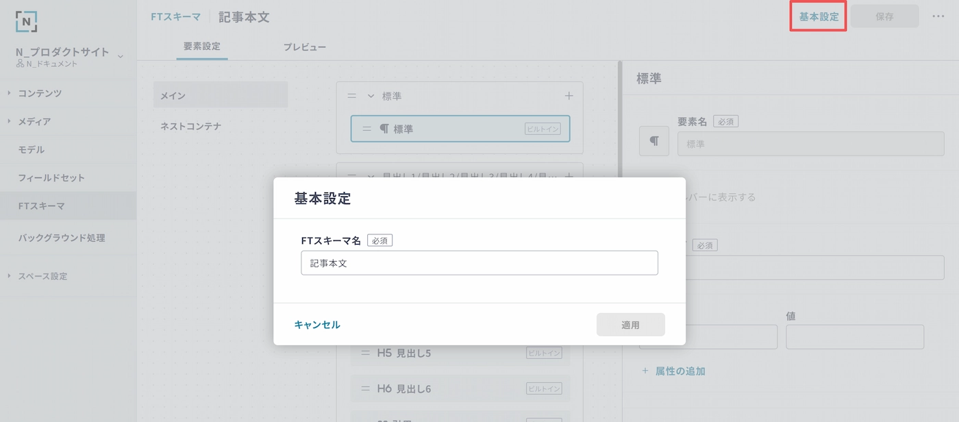 FTスキーマ編集画面の「基本設定」ではFTスキーマ名を再設定できます。