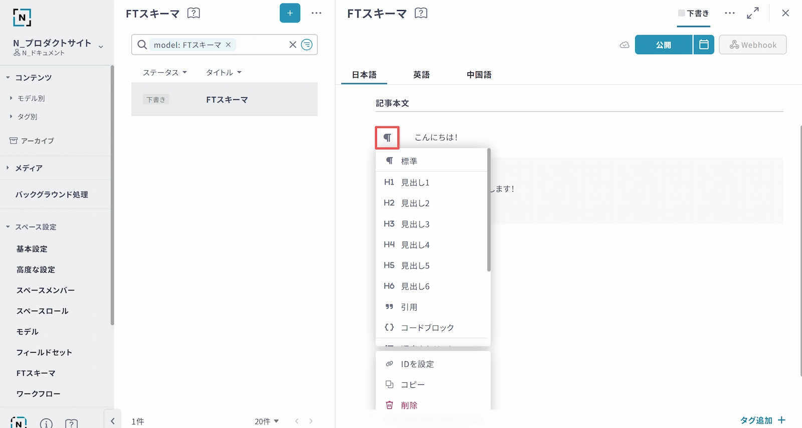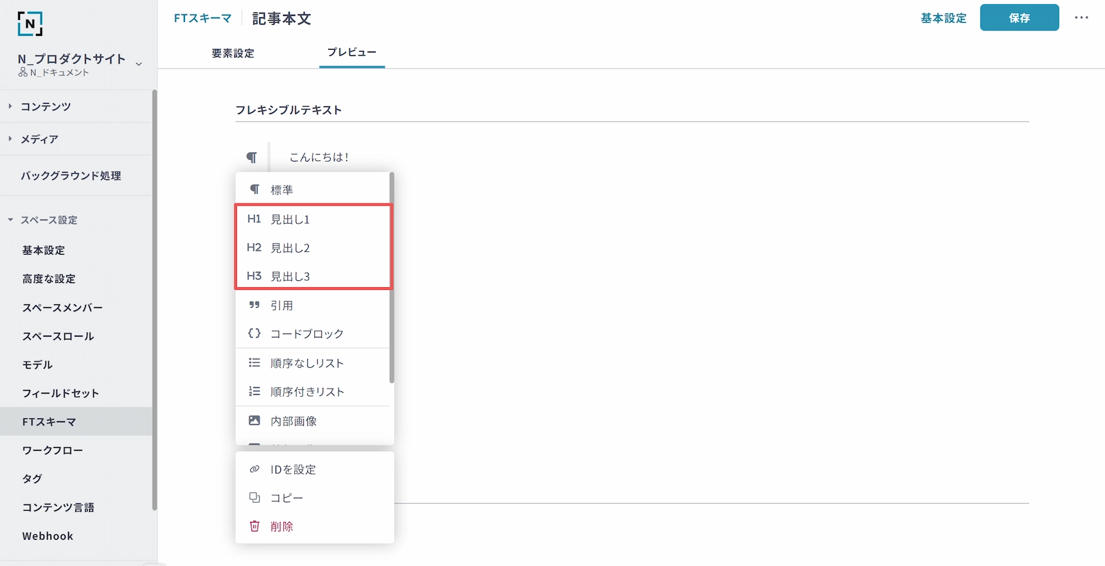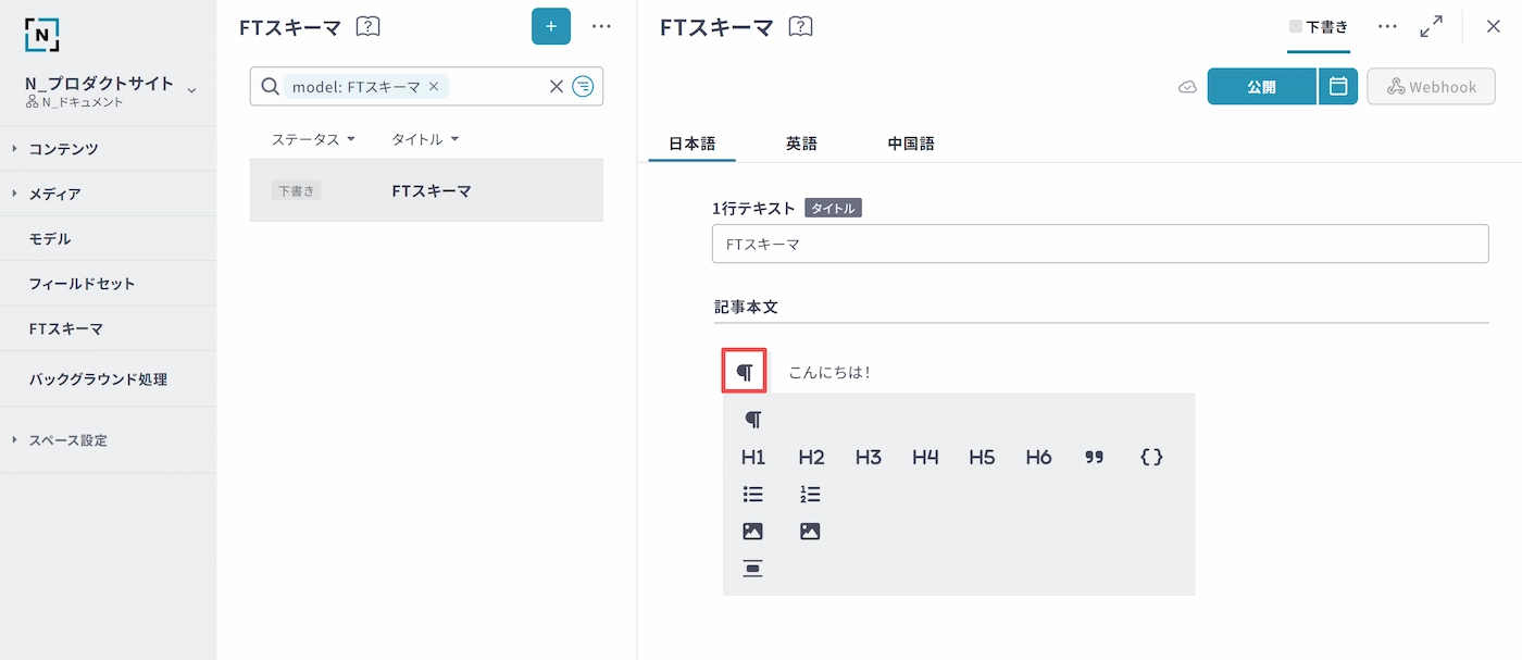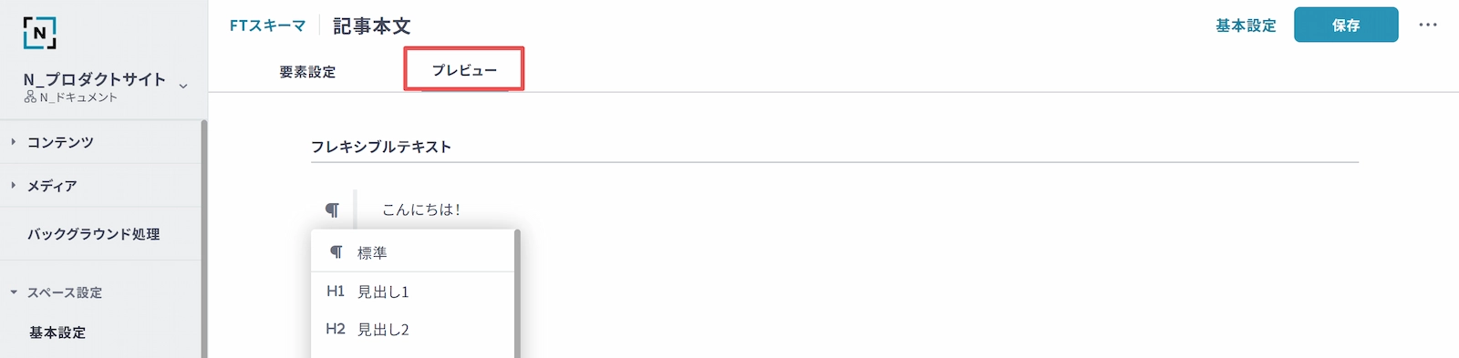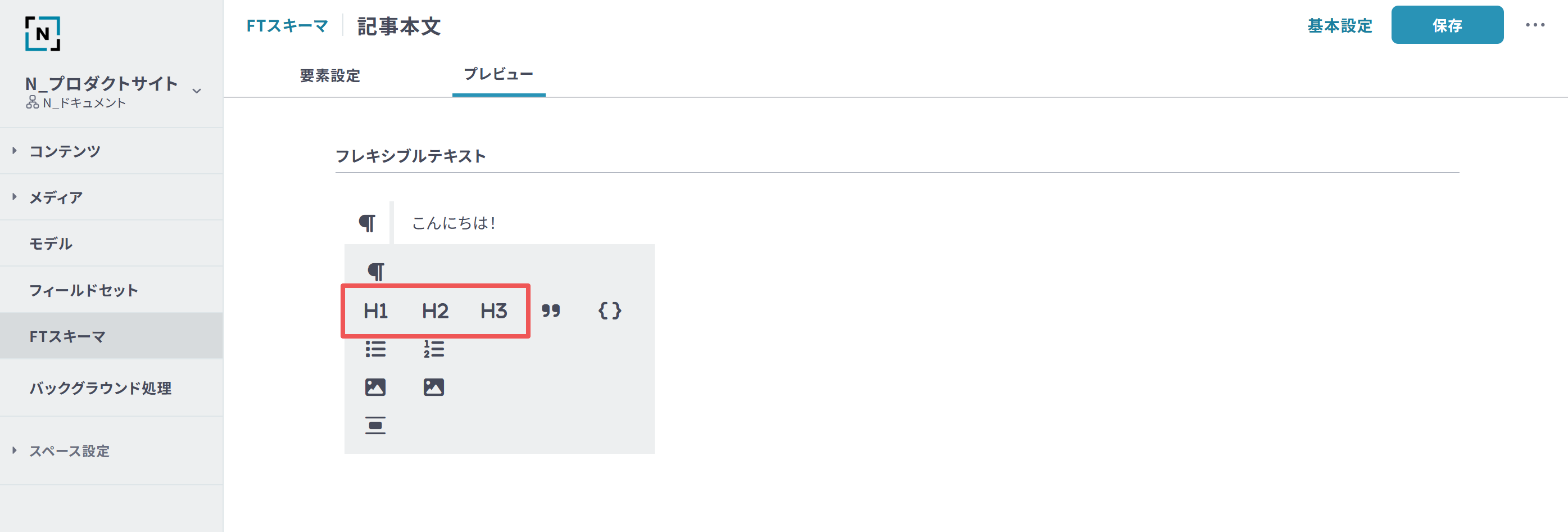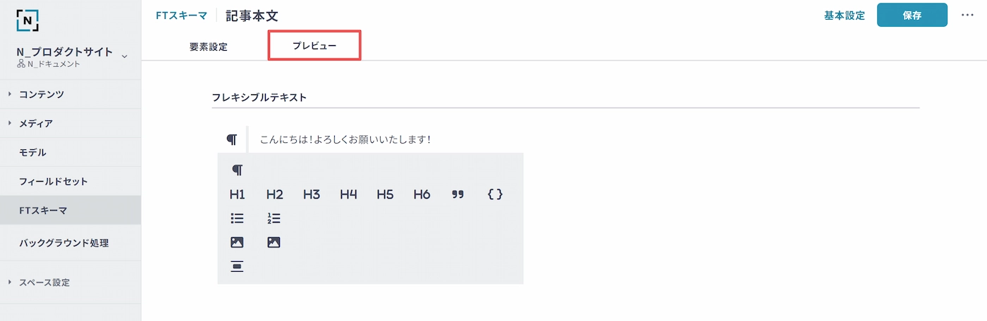 コンテンツを新規作成し編集画面を開くと、フレキシブルテキストフィールドが追加されています。