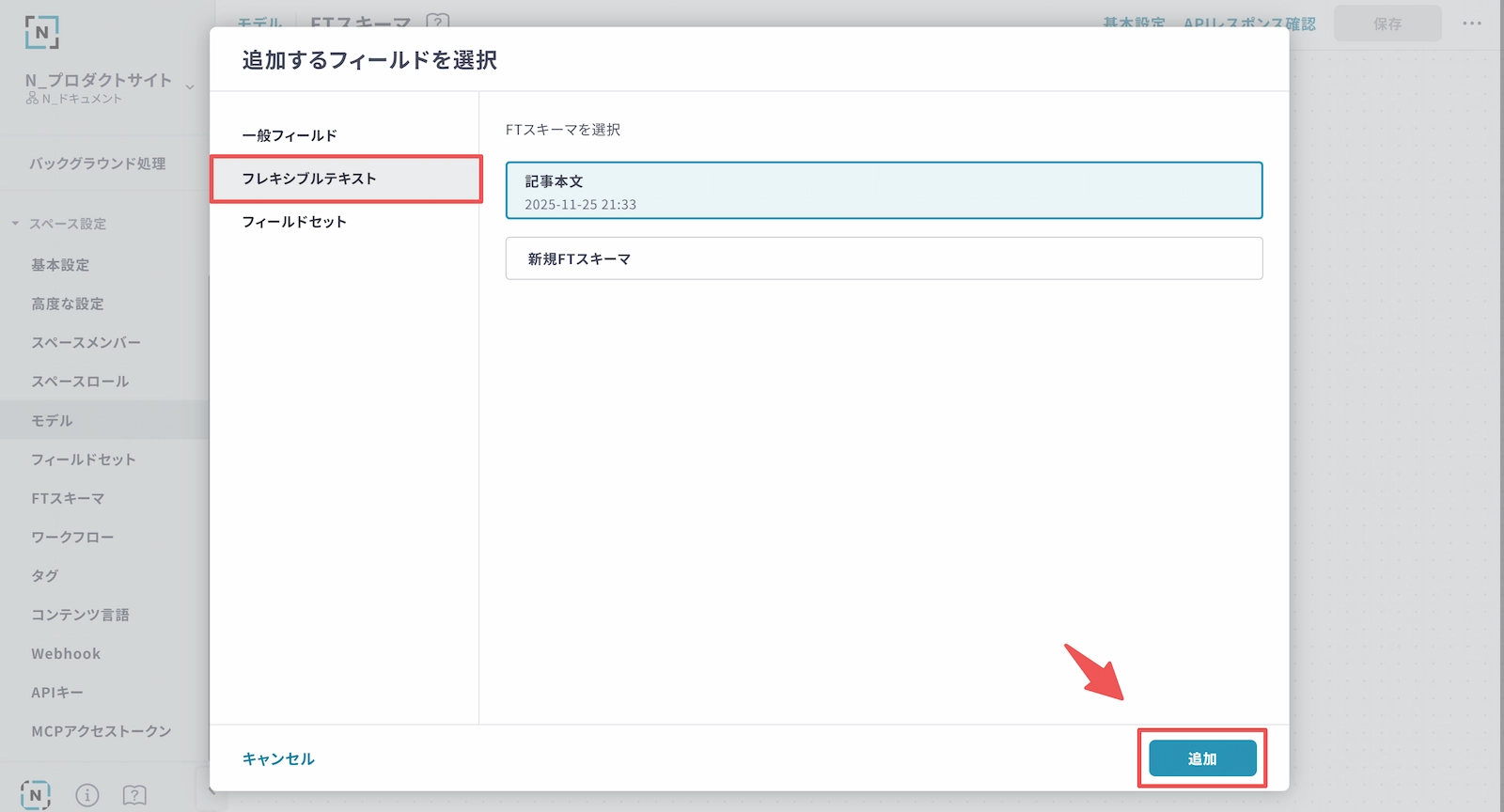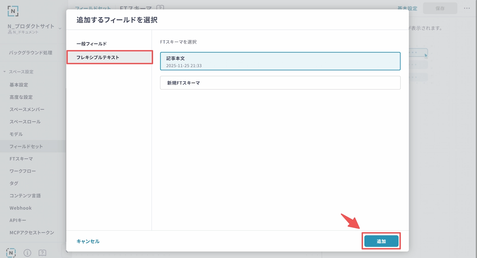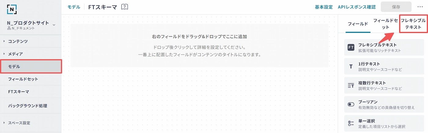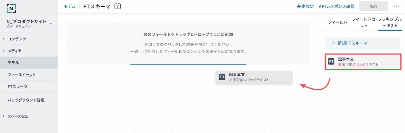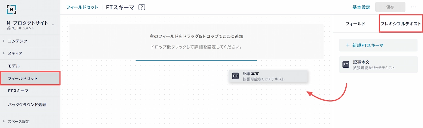 フィールドセット編集画面の右側にある「フレキシブルテキスト」タブをクリックし、任意のFTスキーマをドラッグ&ドロップして追加・保存します。