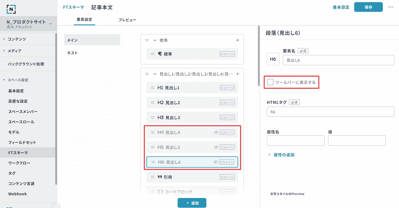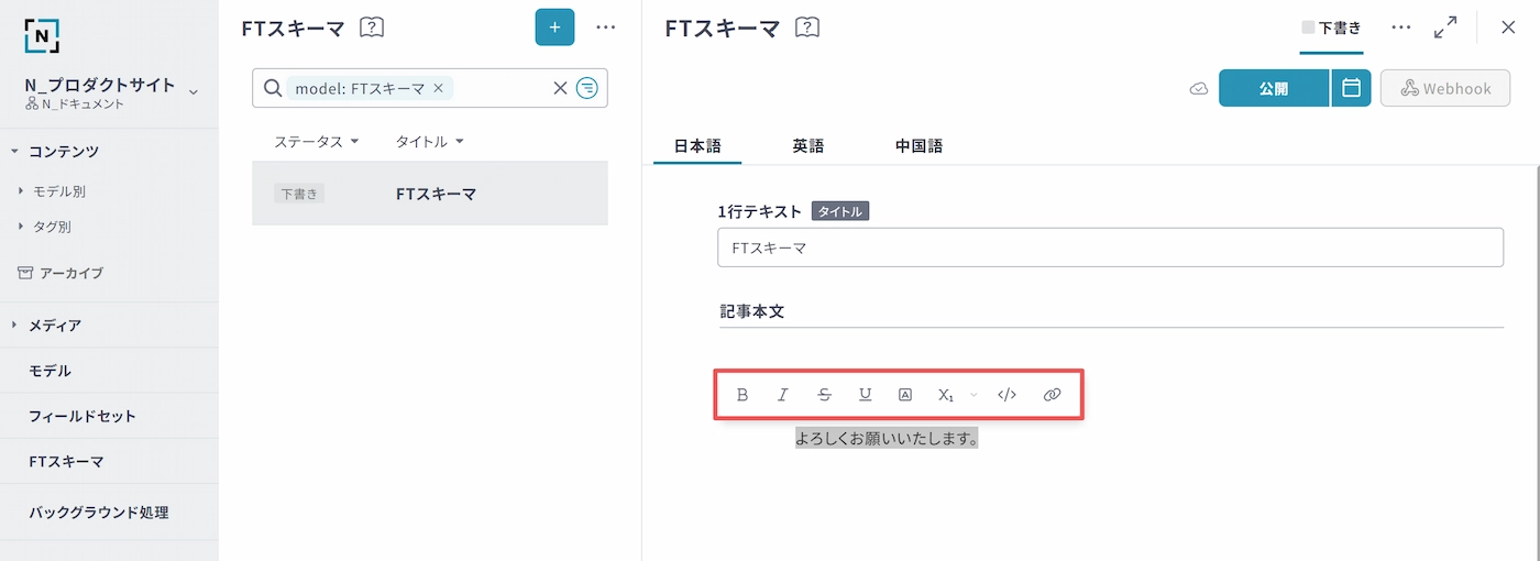 各要素のチェックボックスをオフにして保存すると、該当フィールドでのコンテンツ編集時、ツールバーから表示されなくなります。