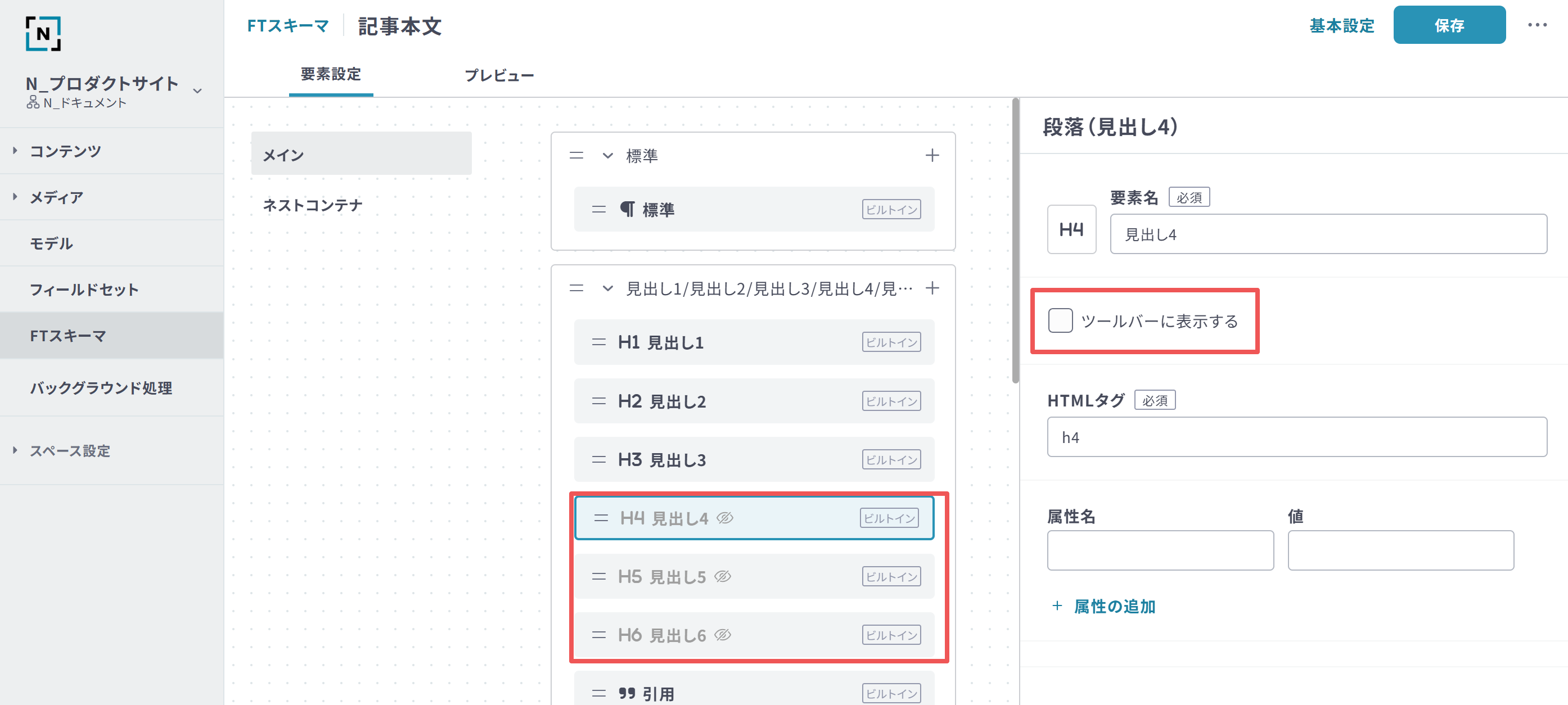 FTスキーマを作成するとデフォルトのツールバーが生成されており、ビルトイン要素がすでに登録されています。