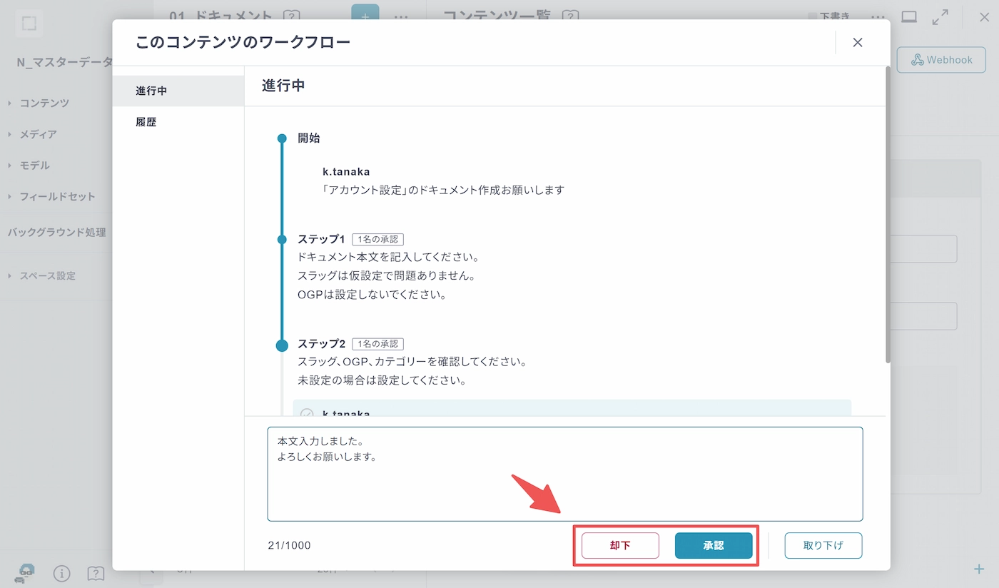自身が作業、あるいは承認の担当者であれば、必要な箇所を確認した上、承認または却下を行ってください。