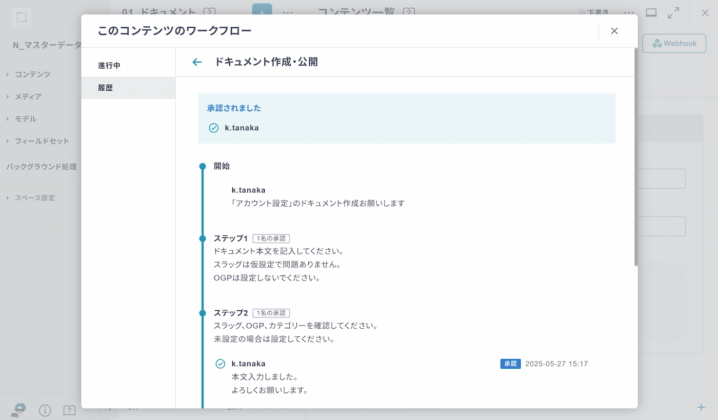 「履歴」タブを選択すると、コンテンツに対して過去に完了・却下・取り下げされたワークフローが一覧で確認できます。