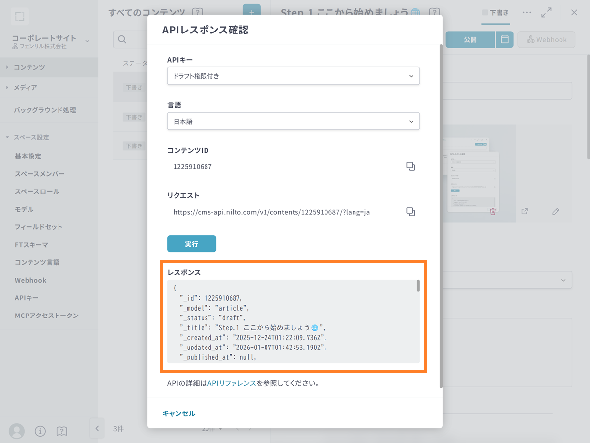 まずNILTOの管理画面で、「記事」コンテンツのAPIレスポンスを確認します。
