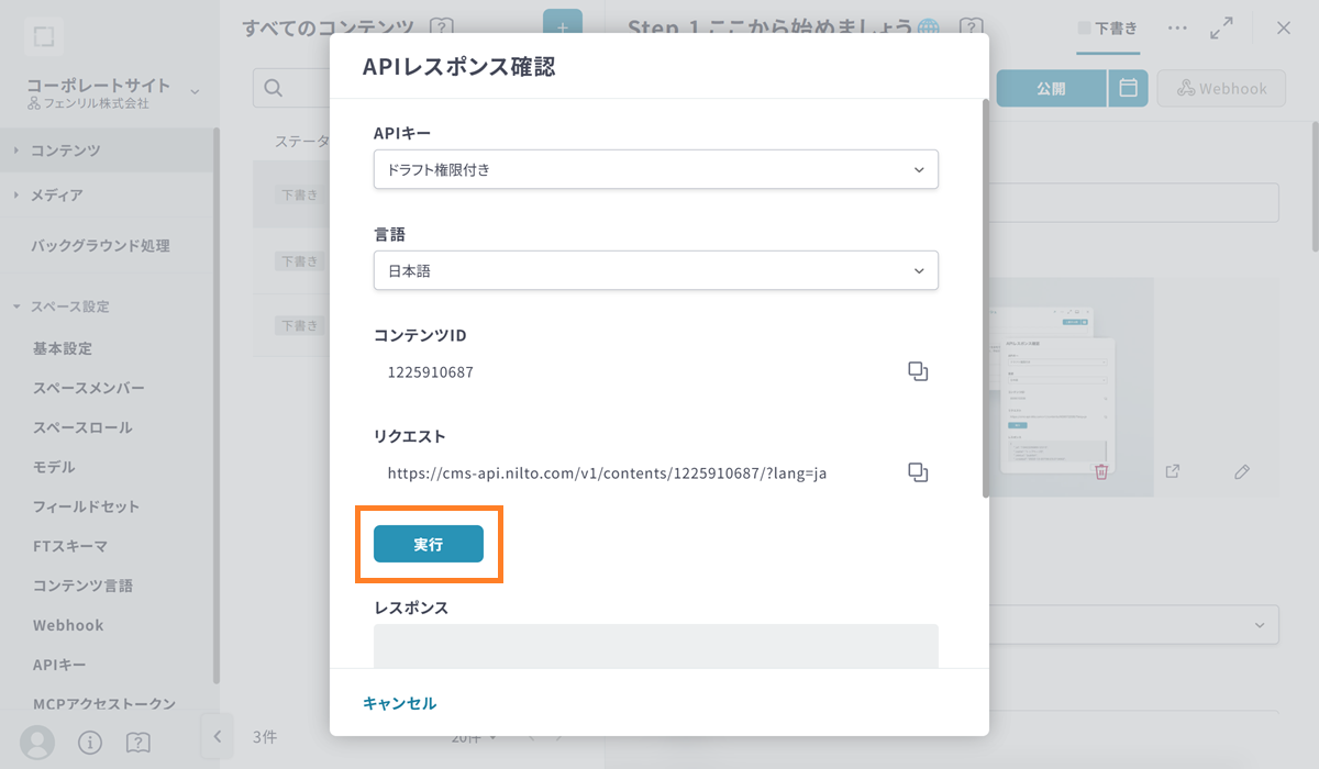 APIレスポンス確認ダイアログが表示されますので、[実行]ボタンを押します。