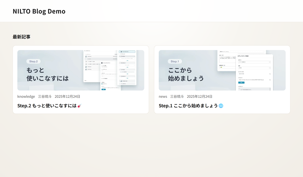 このページでは、NILTOをはじめて使う方向けに、APIレスポンスの確認からサンプルサイトで表示するまで進めます。