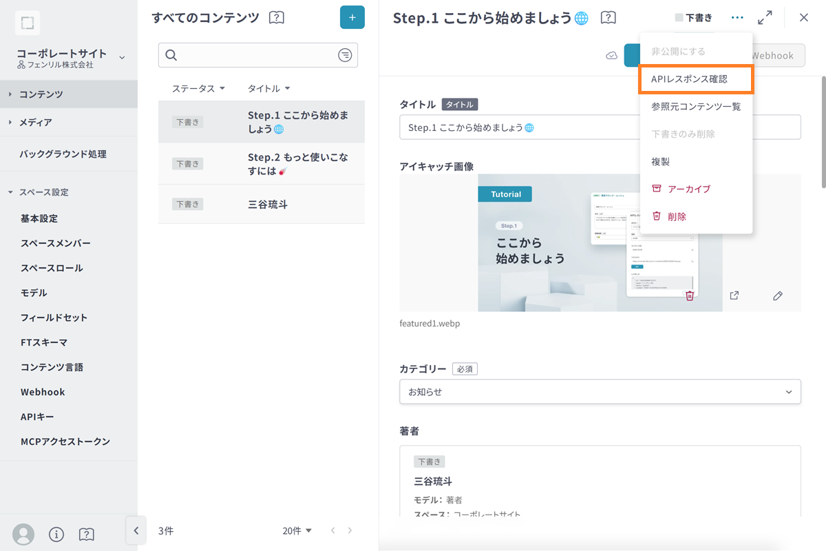 NILTOで「記事」など、確認したいコンテンツを開き、画面右上のメニューから[APIレスポンス確認] を選択します。