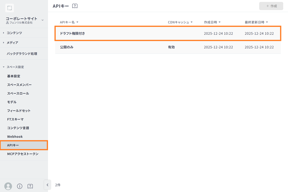 NILTOのサイドメニューから「スペース設定 > APIキー」を選択。