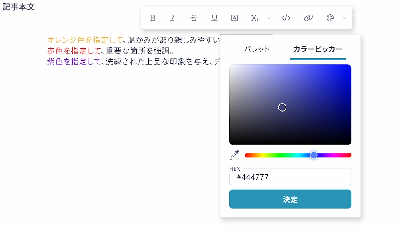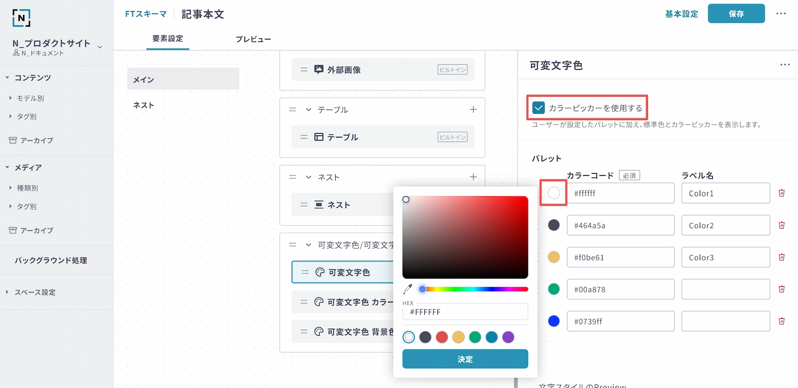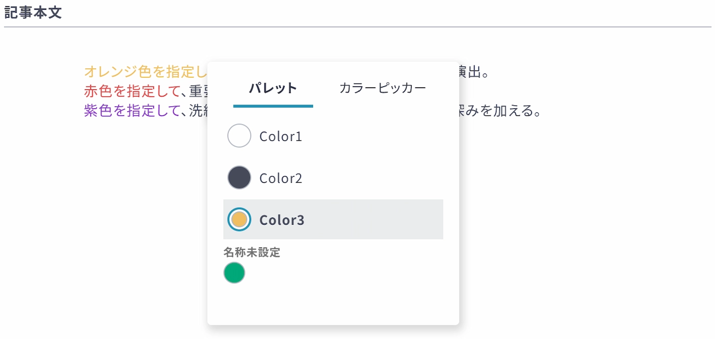 「カラーピッカーを使用する」を有効化すると、コンテンツ編集画面でその都度、好きな色を指定して利用することができます。