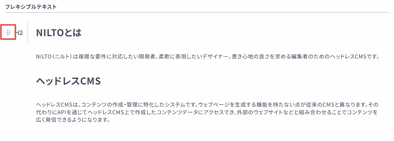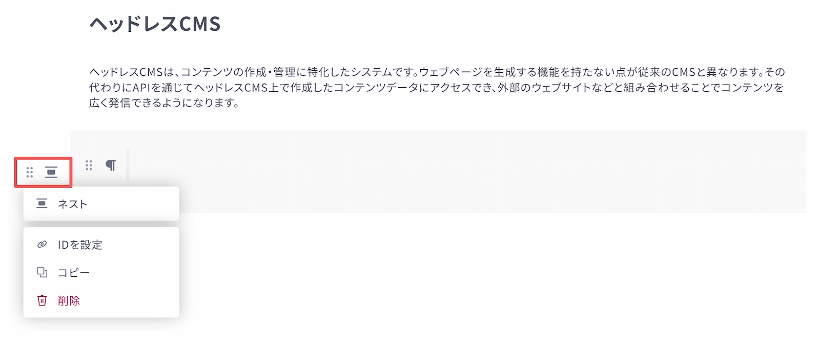 入力したネスト要素に対して「IDを設定」「コピー」「削除」、およびドラッグ&ドロップによる入れ替えが利用いただけます。