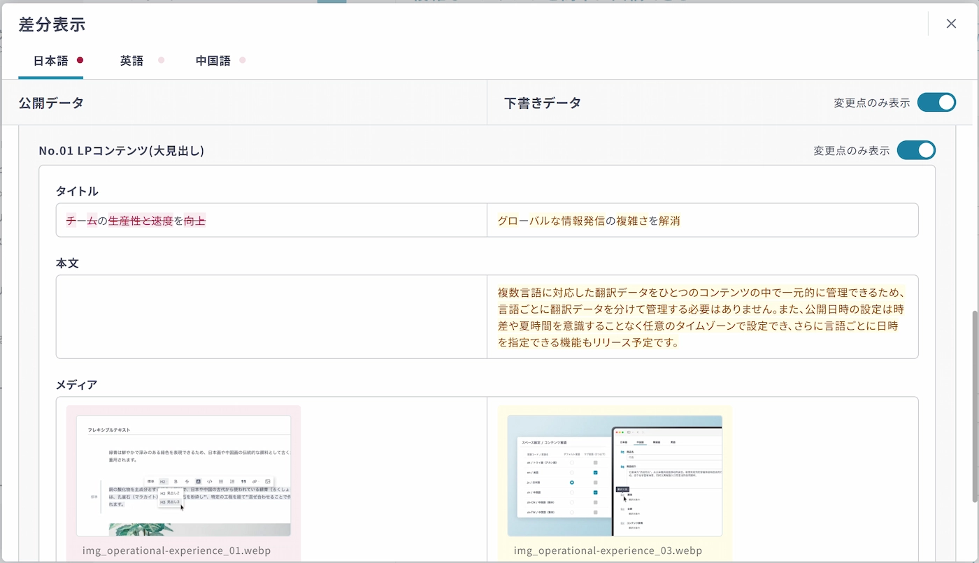 コンテンツを公開する前に変更点の確認をすることで、意図しない変更が含まれないよう事故防止にご利用いただけます。