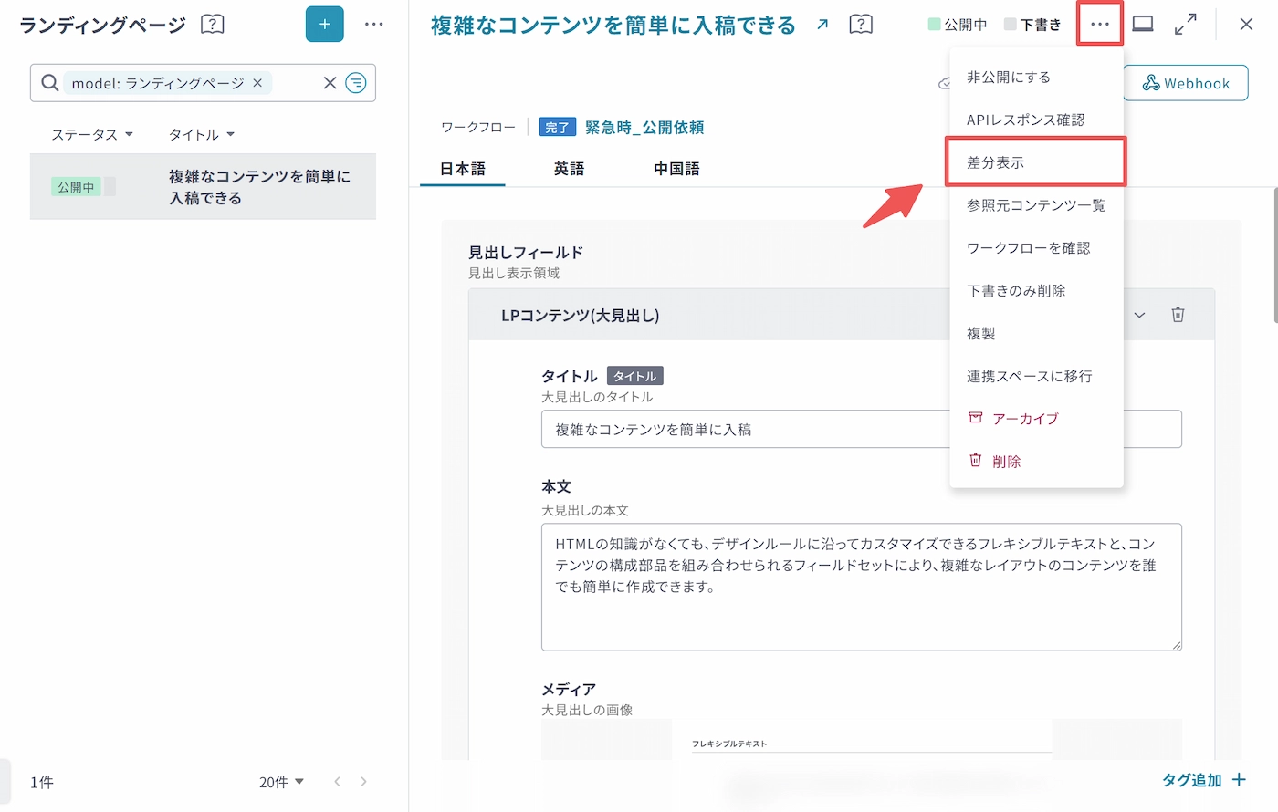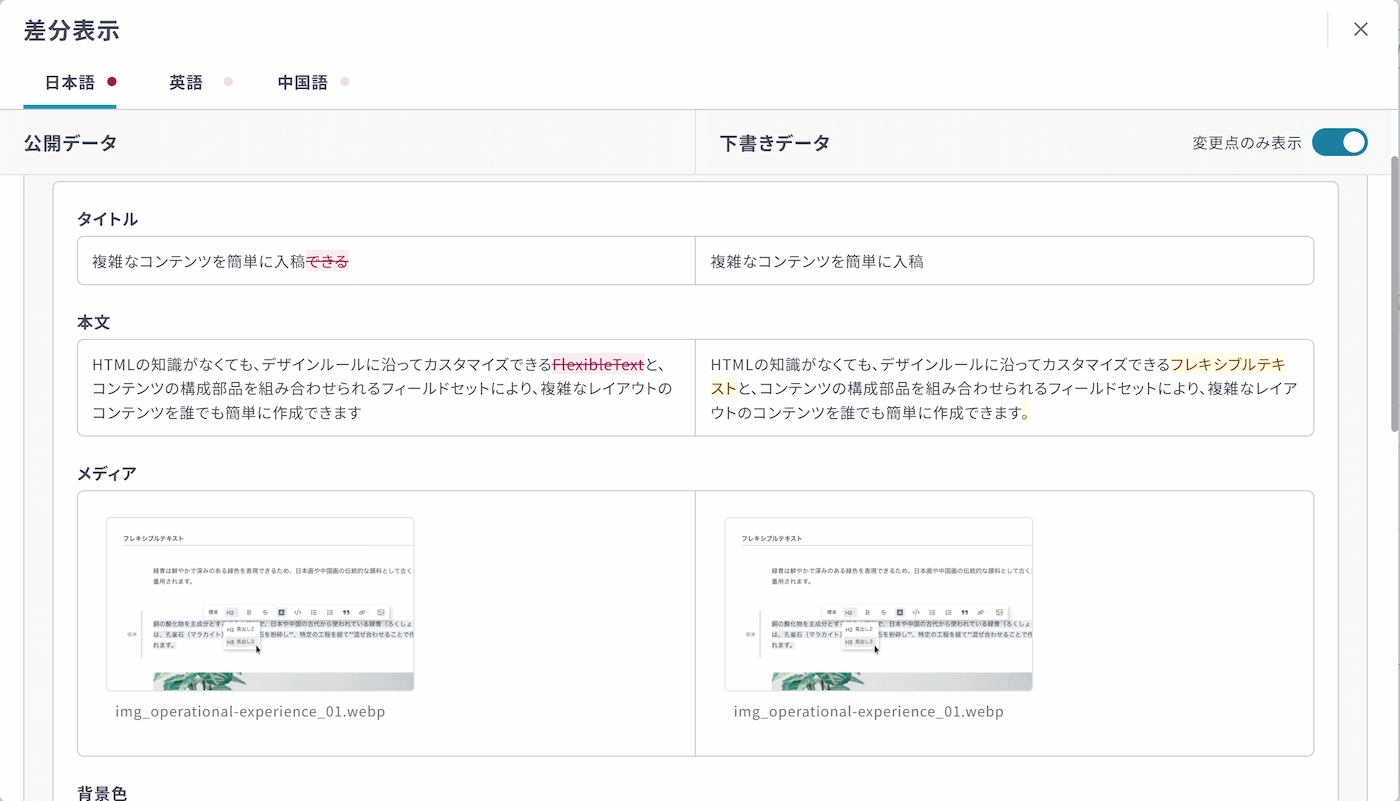 コンテンツの「公開」データと「下書き」データの差分を確認できるようになりました。