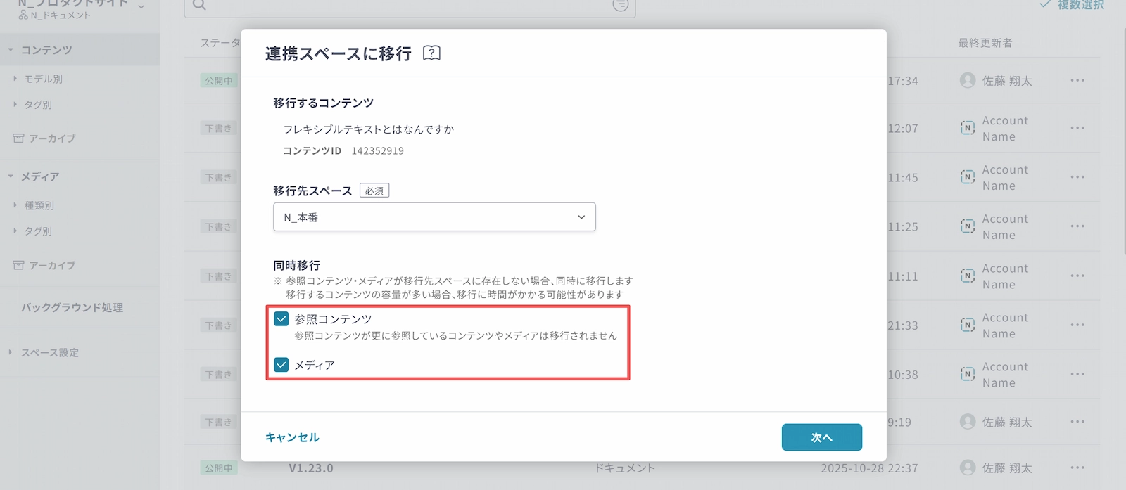 次画面で移行先スペースと参照コンテンツやメディアを同時移行するか選択し[次へ]をおします。