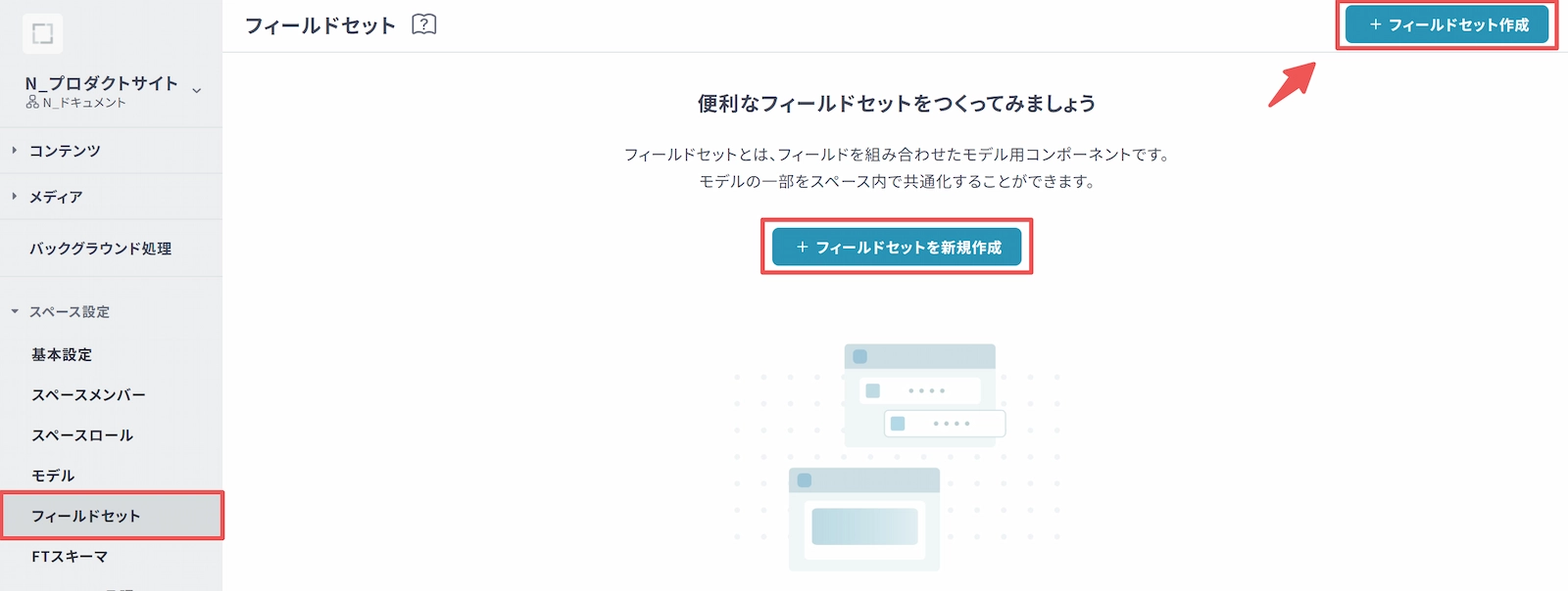 フィールドセット管理画面右上の[+フィールドセット作成]から作成ができます。