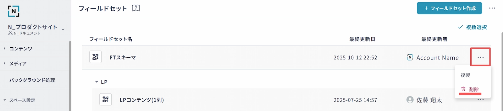 フィールドセット管理画面で対象フィールドセットを右クリックから「削除」、もしくは右端にある「・・・」から削除できます。