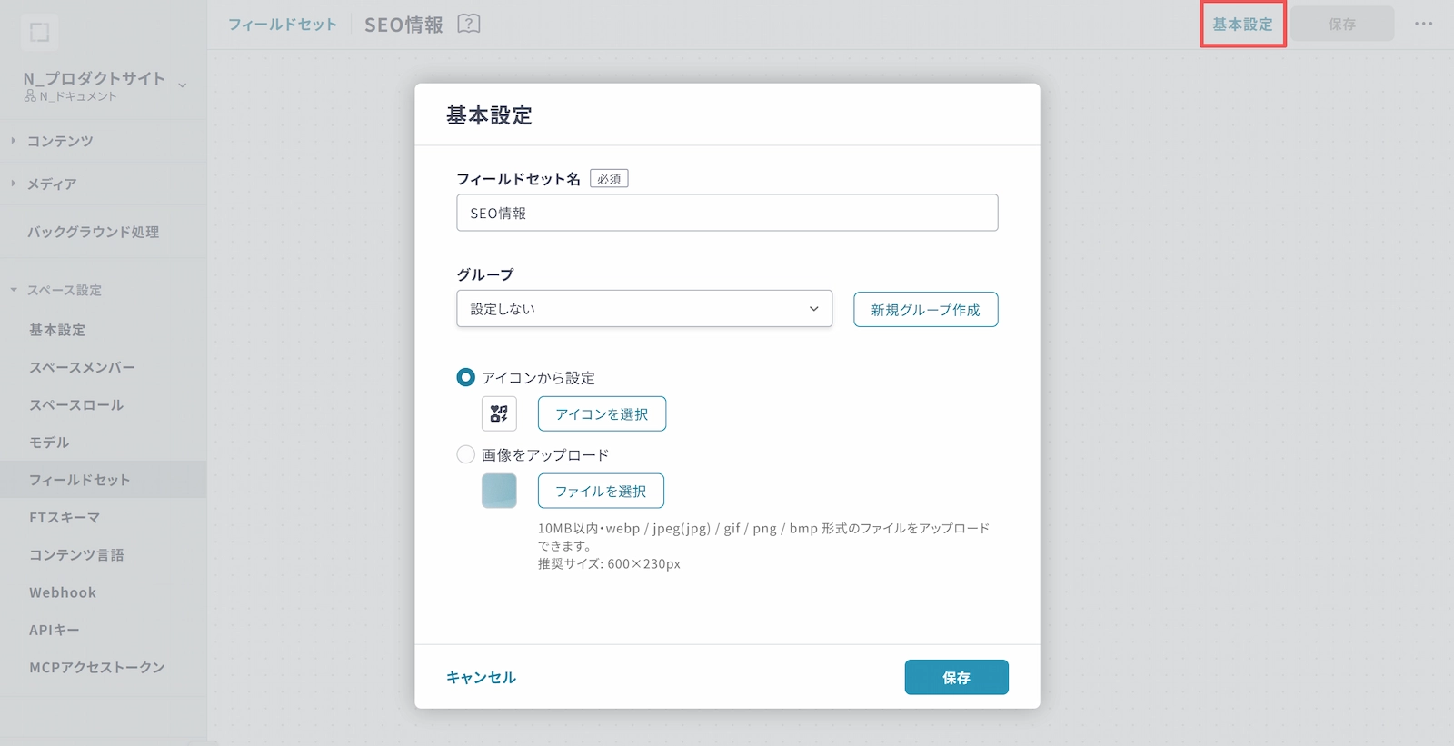 基本情報からはフィールドセット名、グループの設定/新規作成、サムネイルを設定することができます。