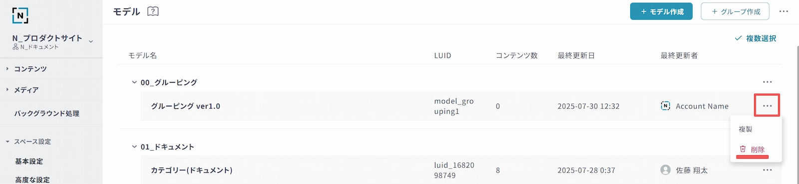また、モデル一覧から消したい対象モデルを右クリックから「削除」、もしくは右端にある「・・・」から削除が可能です。