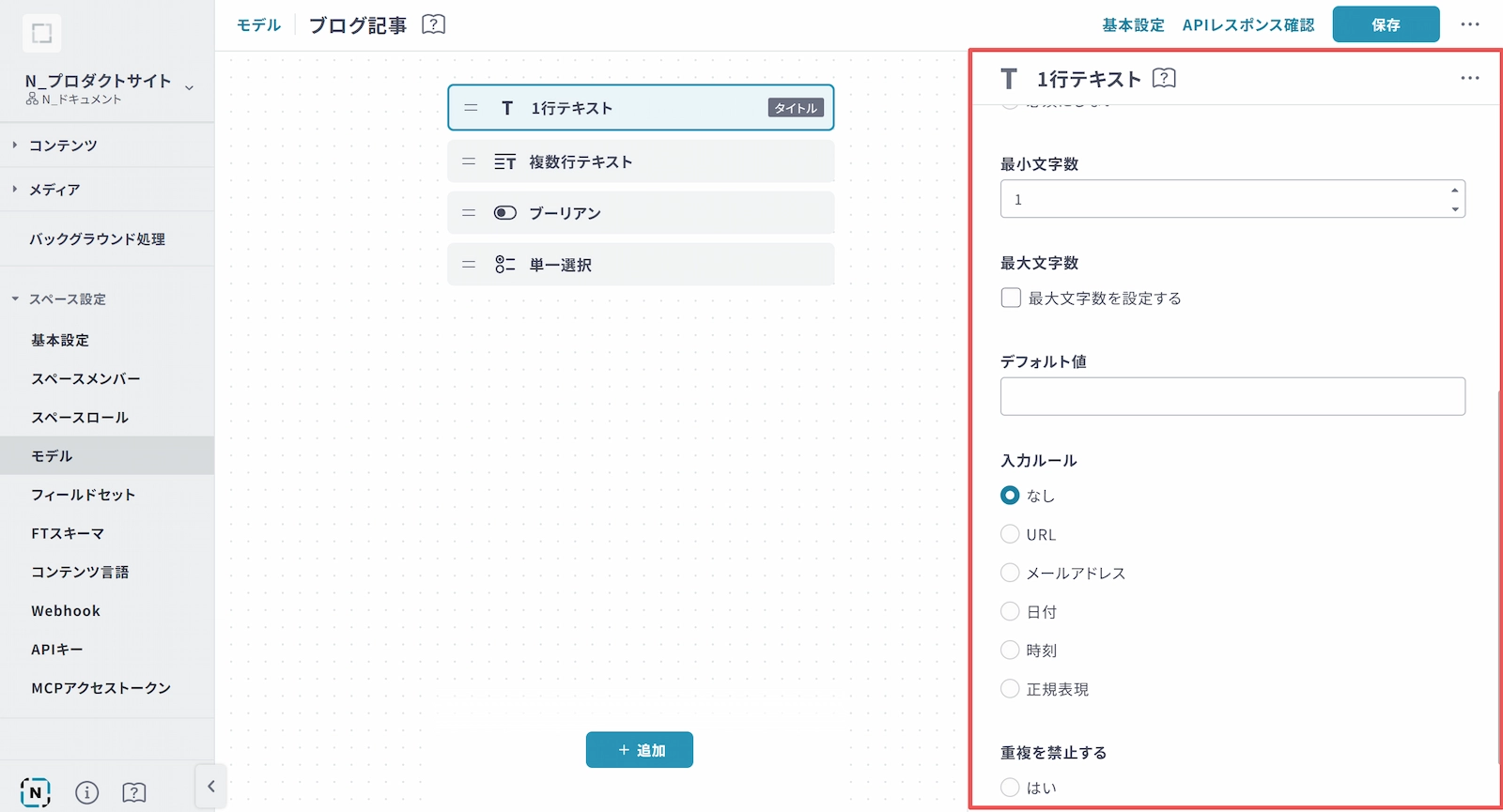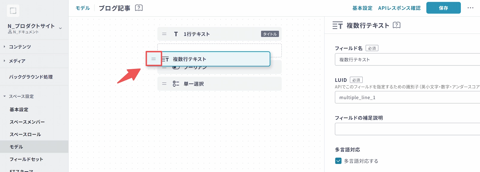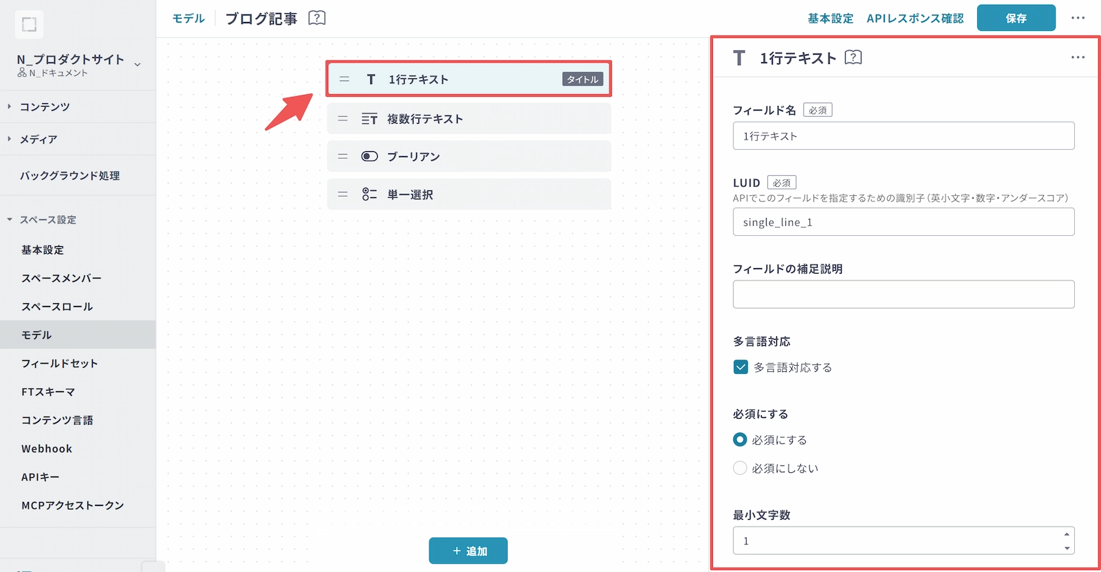 一番上に配置したフィールドがコンテンツのタイトルになります。