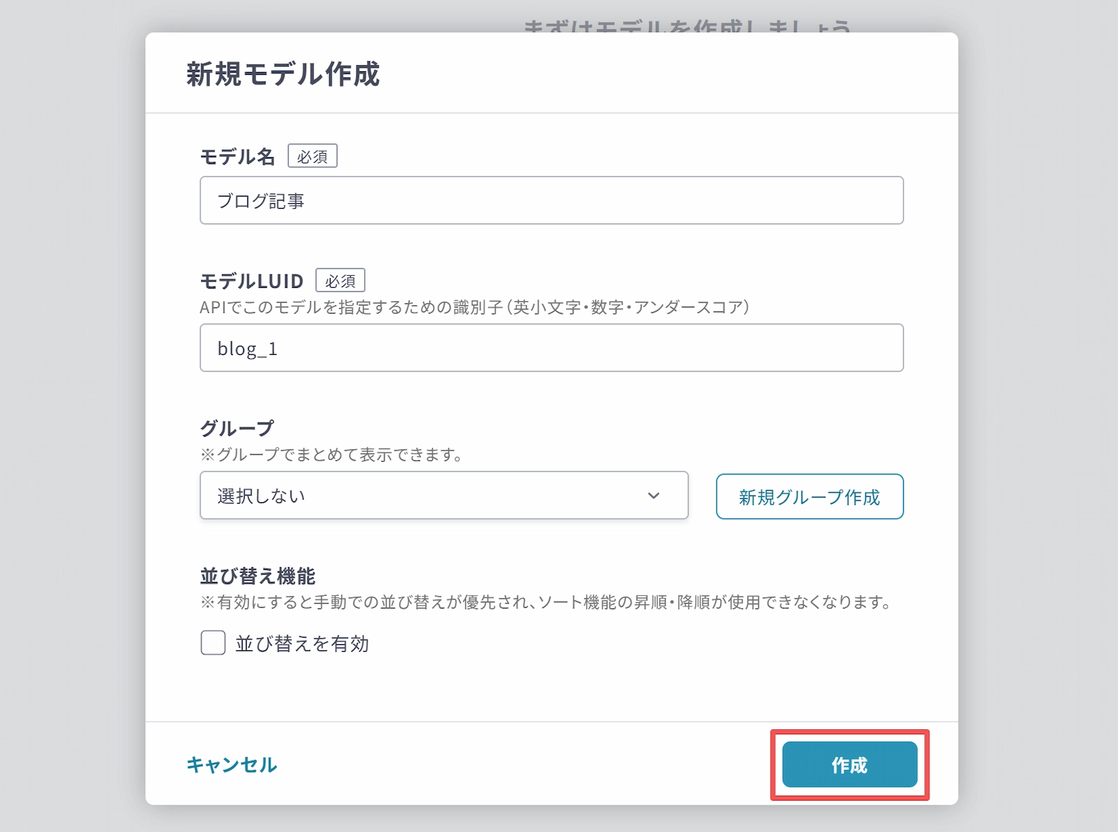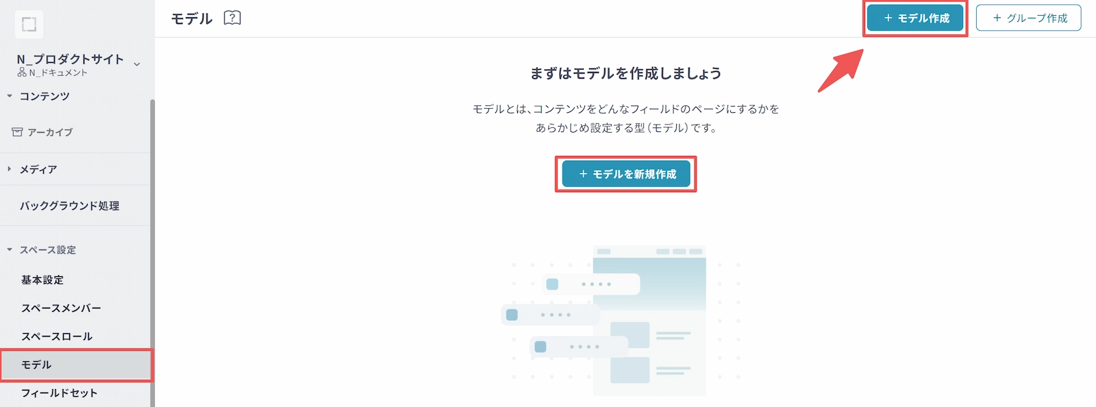 モデル管理画面の画面中央の[+モデルを新規作成]もしくは右上の[+モデル作成]から作成をします。