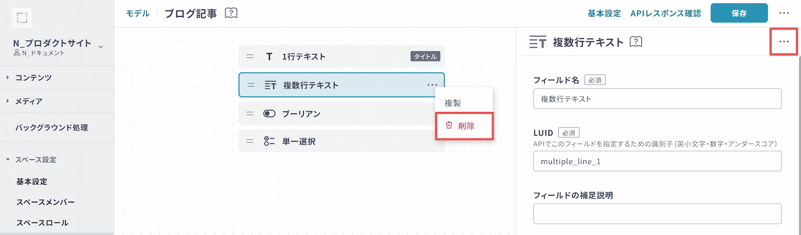 または、対象のフィールドの右端にある「・・・」か、詳細ペイン右端の「・・・」から複製・削除できます。