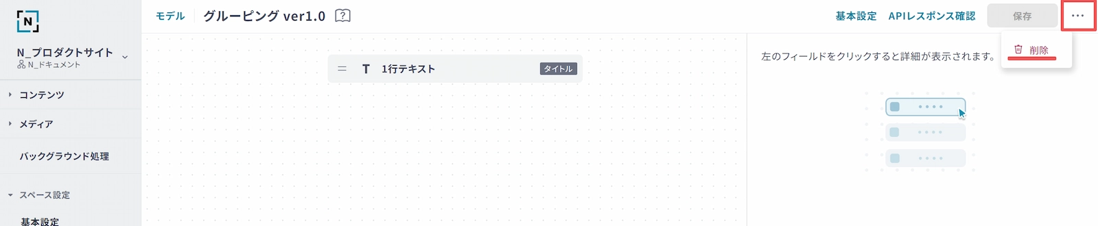 モデルを削除する方法は、モデル編集画面右上の「・・・」から削除ができます