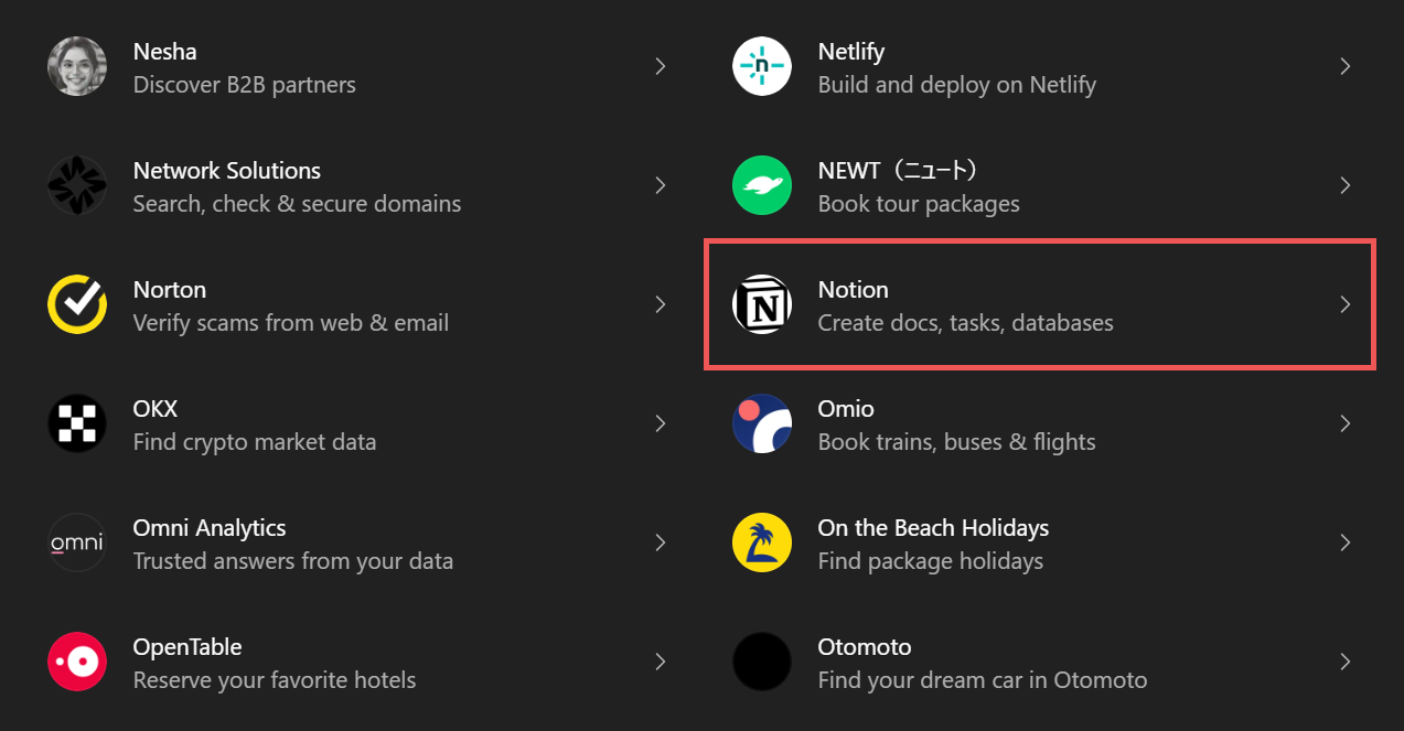 2. 検索ボックスに「Notion」と入力し、一覧の中からNotionを選択