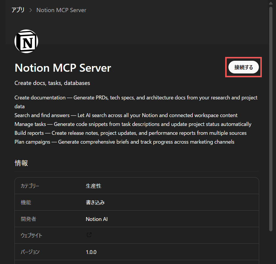 Notion MCPは、AIツールからNotionワークスペースに接続するためのNotion公式のMCPサーバーです。
