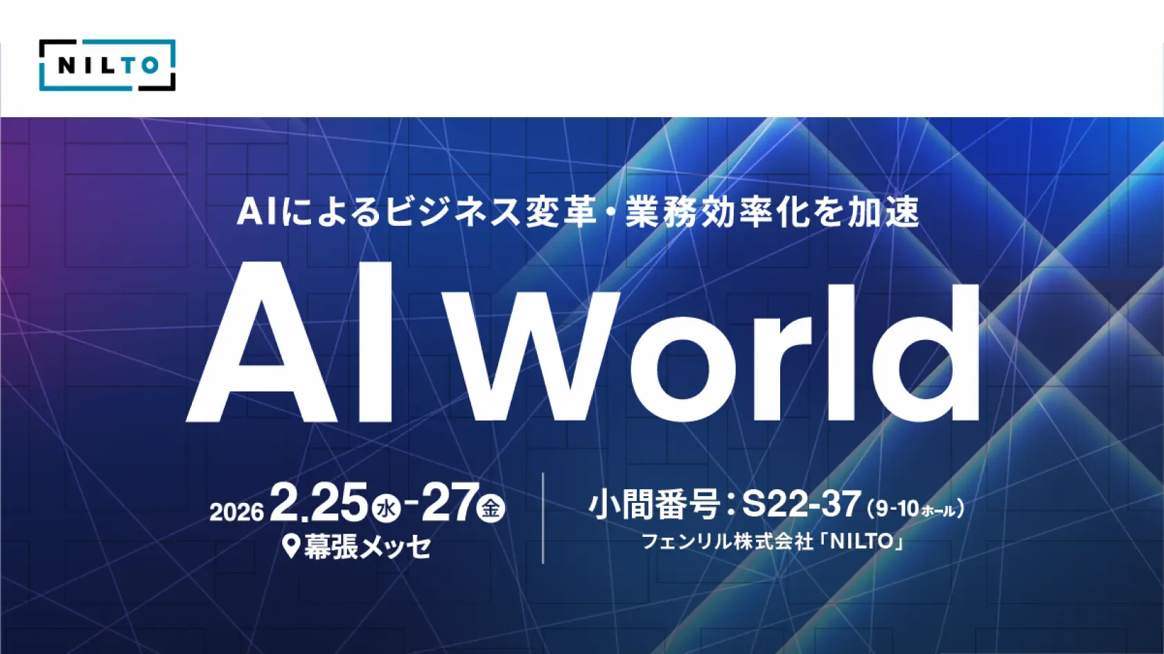 2026年2月25日(水)~2月27日(金)に、幕張メッセで開催される「AI World 2026 春 東京」内の「AI業務改革 EXPO」にNILTOのブースを出展します。