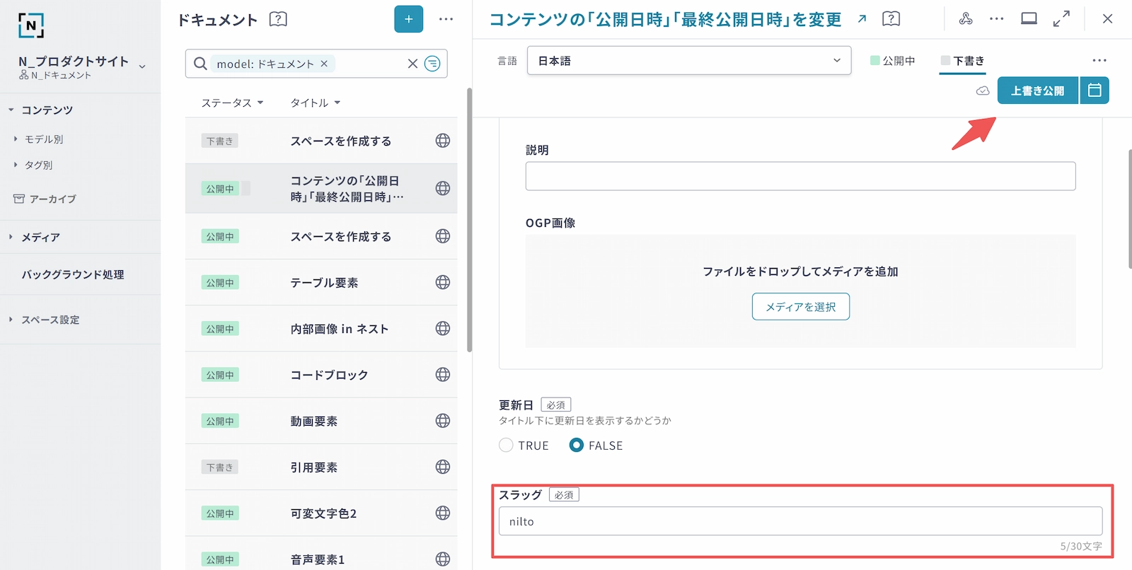 入力ルールに違反がある状態では「公開」ボタン(または「上書き公開」ボタン)が非活性になります。