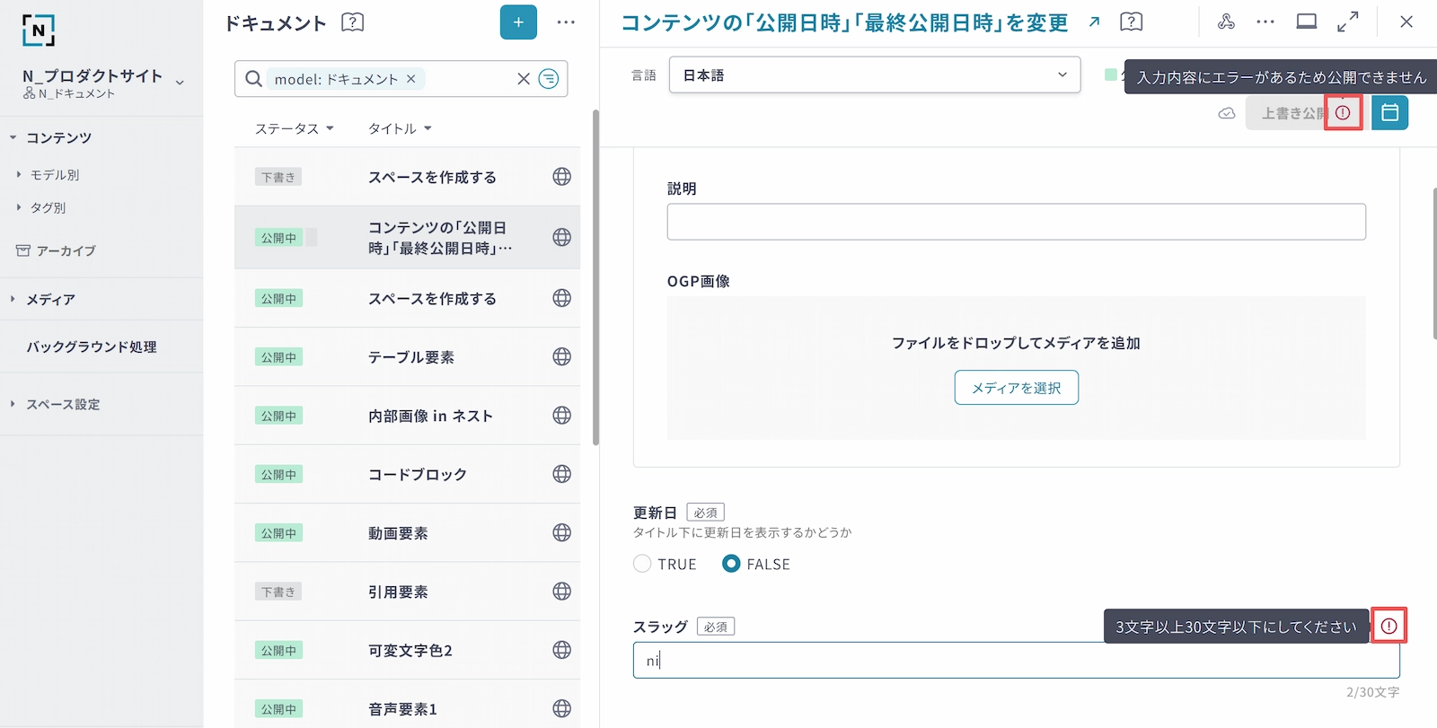 コンテンツ内容を確認し、[ ! ]アイコンが表示されているフィールドを修正することで、公開可能になります。